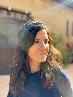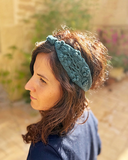 The headband is knitted sideways, starting and ending with an I-cord that serves as a tie to adjust it around the head. After finishing, it is completed with a small buckle or a stockinette stitch bow at the center.