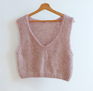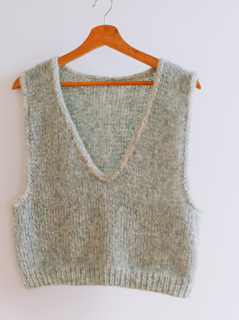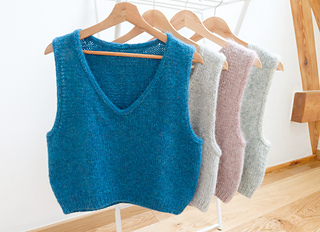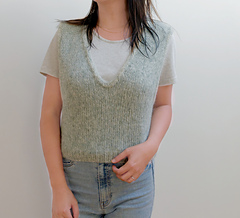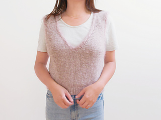 This sleeveless sweater is knit in the round from the bottom up. After reaching the underarms, the work is split into front and back pieces.