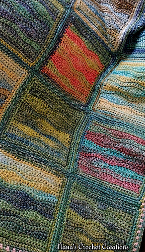 SAMPLE BLANKET ASSEMBLY DETAILS: A total of 12 squares were made using Caron Blossom Cakes in “Radiant Rainbow” and “Tide Pool”. Also, some leftover Hobbii Cascata in # 9 (Rio Verde) was used. The squares were laid out 3 x 4 and joined with a tight join. After they were joined a round of Moss Stitch was done all around, making SC, CH 2, SC in the corners. The last round of Moss Stitch was done using the same color as the joining. (Caron Blossom Cake in “Tide Pool”. Blanket measures approx. 26” x 34”.