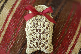 Two patterns in one! One larger soap sack and one smaller done in beautiful yet simple lace patterns and dropped stitches. These linen sacks are worked flat, then seamed, gathered with a silk ribbon at the top. Use a size US5 or 6 straight needles for the lace look you like best. One hank of linen makes 4 or 5 soap sacks. If you have never tried lace before or need a great quick gift idea, this pattern is for you!