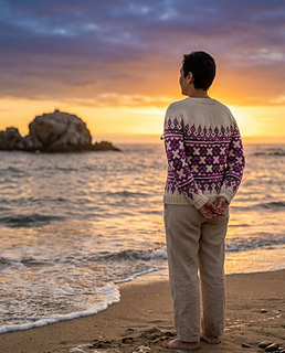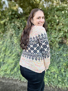 Comienza en el cuello, trabajado con vueltas cortas para un mejor calce, y continúa con una sección en punto jersey antes de dar paso al motivo principal en dos colores. El colorwork se extiende armoniosamente por el cuerpo y las mangas, creando un diseño equilibrado y moderno. El cuerpo se finaliza con un elástico doble, mientras que las mangas incluyen disminuciones sutiles que estilizan el ajuste.
