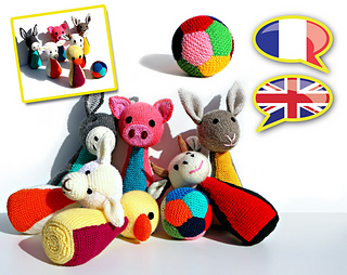 This pattern includes the instructions to knit the 6 skittles animals of the farm and the multicolored ball.