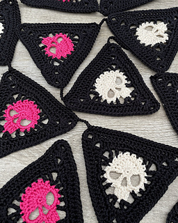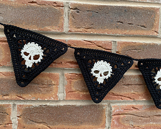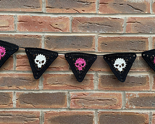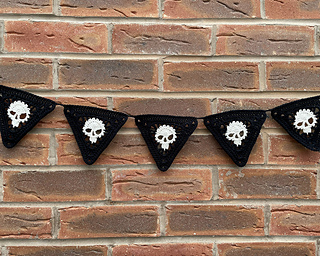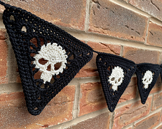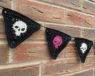This is a PDF pattern for a skull crochet bunting. You can make it as long or as short as you like, and it’s a perfect stash-busting project! You can use any 4 ply or DK yarn to make it. A perfect Halloween decoration or an addition to your home!