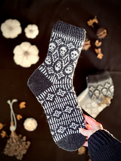 These socks are knitted top down (from cuff to toe) with a ribbed cuff and a simple short-row heel. They are finished with a barn toe and closed up with Kitchener stitch. You can choose between two length options for the leg with slightly modified pattern designs to accommodate the length difference. The patterns both on leg and foot are done with stranded colorwork in two colors.