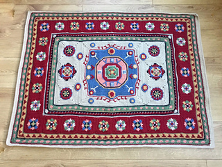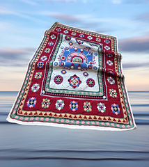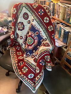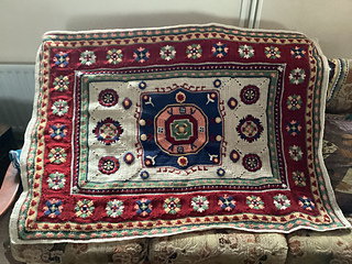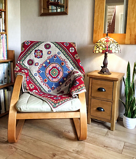 Inspired by the beautiful Kazak designs originating in the Caucasian mountains, this throw captures some of the motifs and rich colours commonly found in this intricate, decorative style of hand-woven woollen rug. It brings to mind flying carpets, and the magic and mysticism of Eastern folklore.