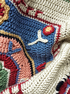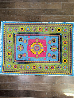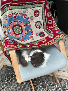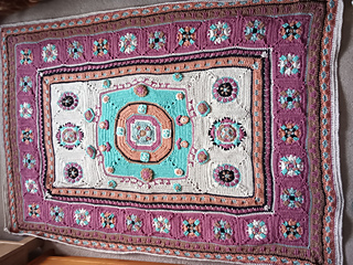Originally intended to be an afghan or a sofa throw (or even a cot blanket for a sophisticated toddler!) the design could of course be put to other uses. Some great ideas from tester Rosy: make it in pure cotton with a finer hook for a wall hanging; use 100% wool and felt it, to make an actual rug, or use just the centre square for a cushion front. Also if you wanted to make a rug you could stitch on a buckram hessian backing for added stiffness, or place it on a felt or rubberised base cut to size.