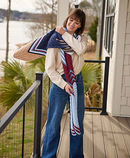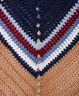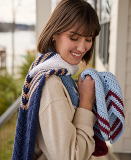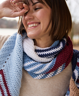 This Wrap is crocheted flat from end to end. It’s decreased at the beginning and end of each row and increased in the center, creating a chevron shape. When changing colors, work the final pull-through of the last stitch of the row with the new color. Cut colors and weave in ends at each color change.