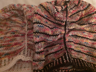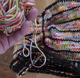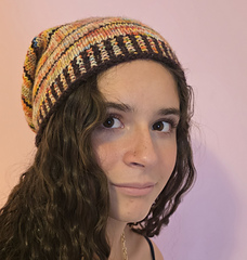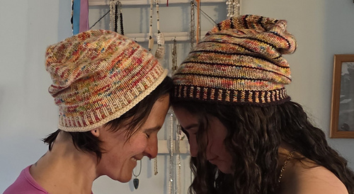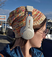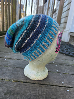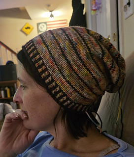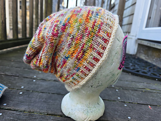 The world’s best slouchy hat! Elongated slipped stitches create a ruching which gives the hat a nice slouch, and hides any jogs in the stripes