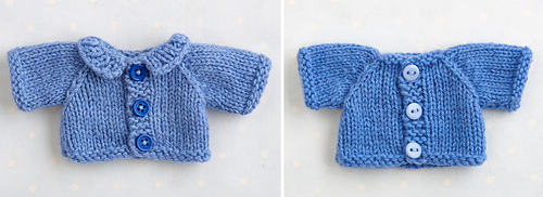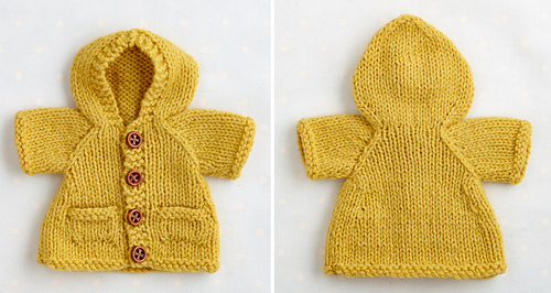 All garments are knitted flat and seamed with 2.75mm (US 2) needles and 4ply/fingering weight yarn. They are worked from the bottom up in separate pieces that are then joined at the neck by the collar/hood. The sleeves are picked up from the armhole edges and worked from the top down, using short row shaping to create the raglan sleeve shape.