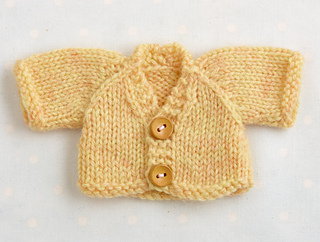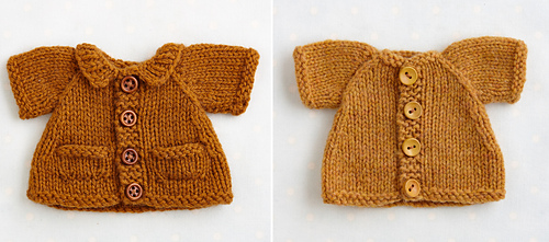 The short cardigan/jacket and the longer A line coat can both be made with either a round neckline, a little ribbed collar or a hood. The hood will fit over the head of the animals with smaller ears such as the mouse and bear and for the animals with taller ears it looks nice just folded at the back and I’ve designed it with a curved bottom edge when it’s worn in this way.
