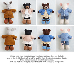 This pattern is designed to fit my range of toy animal patterns (the small 7 inch size not the larger 9 inch). It does not include the patterns for any of the animals nor any of the other clothing (not dresses, shorts or shoes). Those patterns are available separately and are only shown here to illustrate the coats and cardigans being worn.