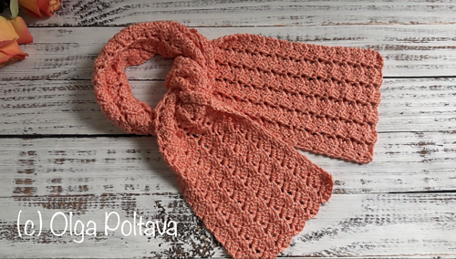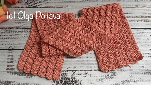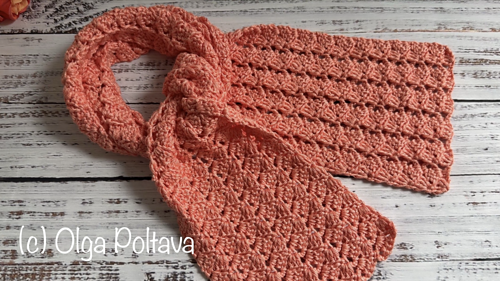 This is a pattern for an easy crochet lacy scarf, made with category 3, lightweight yarn, and size E (3.5 MM) hook.