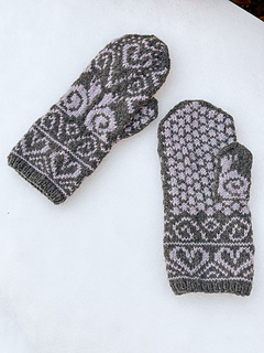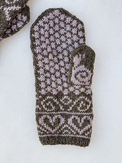 These mittens are worked in the round and use 2 skeins of contrasting colours. The sample mittens were knit with Knit Picks Wool of the Andes sport weight yarn. There was only a tiny ball of the main colour remaining when they were done, so make sure you have enough MC to finish the pair!