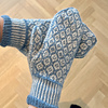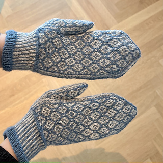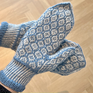 The mittens are knitted in two-stranded colorwork worked in the round from the cuff up. Later stitches are picked up for the thumb. This pattern is recommended for intermediate beginners with a difficulty score of 3/5. The chart is easy to follow and repeatative enough to memorize.