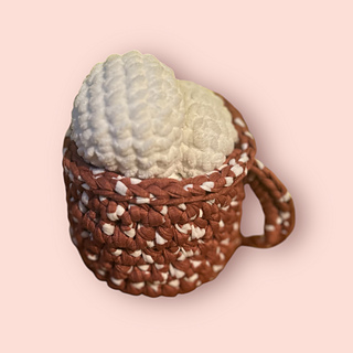 • T-shirt yarn: I used YarnArt Maccheroni 90% Recycled Cotton, 10% Polyester, 7oz/200g, roughly 46 yds/42 m. You can make the mug in any of the various colors they have available, or use a ribbon yarn or a few strands of worsted held together.