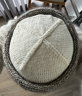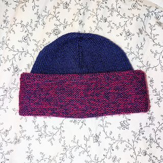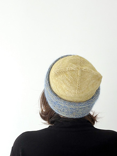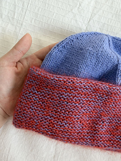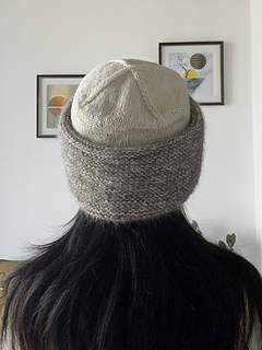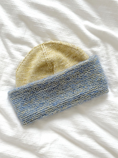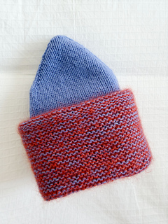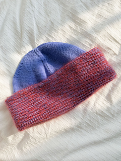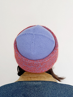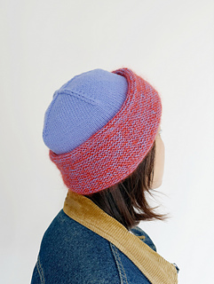 Snowcone Hat is a beanie featuring a colorful brim knit with two contrasting yarns held together—one strand of lace-weight mohair or alpaca-blend yarn and one strand of fingering-weight yarn—to create a playful color-mixing effect. The main body and crown are worked with two strands of the same fingering-weight yarn held together. The hat is worked from the bottom up and in the round thoughtout. The finished brim is intended to be folded twice, forming a three-layer section for added warmth and enhanced protection for the ears and forehead against the winter cold.