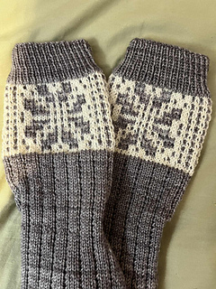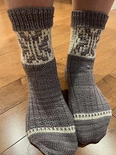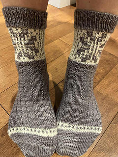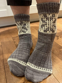 The “Snowflakes” socks are worked cuff down with a reinforced heel, using the herringbone stitch.