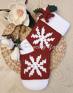 A Christmas décor that enhances your fireplace for the Christmas season. The Snowflakes of Christmas Stocking is exquisitely textured by using the Mosaic technique with rows and columns of Front Post Half Treble Crochet stitches, creating a very textured and bulky fabric. Topped with a bold and sophisticated cuff, trimmed with pearls.