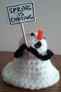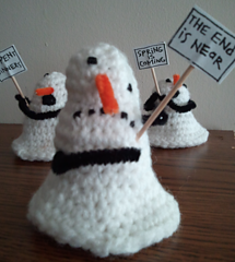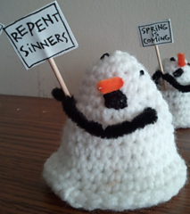 - Scissors, paper, marker, glue for the signs. I don’t recommend glue sticks, because they don’t hold the toothpick/skewer very well. * The ability to count, and the patience to sustain you through frogging because your round is off (Experience is a cruel teacher, although it doesn’t really matter. We’re making deformed snowmen, aren’t we?)