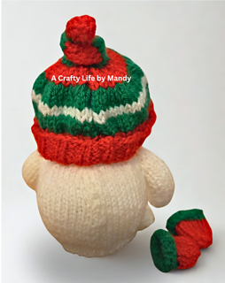 He is knitted flat using 3mm straight needles and DK yarn. I used a crotchet hook to make the straps on his hat, but a ribbon would be just as cute.