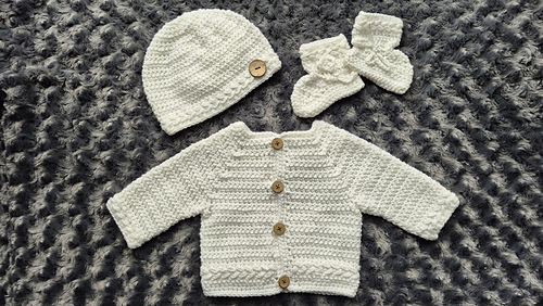 With the purchase of this pattern you will get the pattern for the hat, sweater and booties in a newborn size.