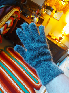 The back and front of the gloves are knit separately, using the 3-ply for the back and the angora for the front.