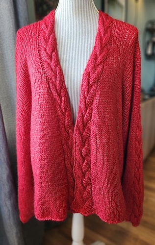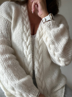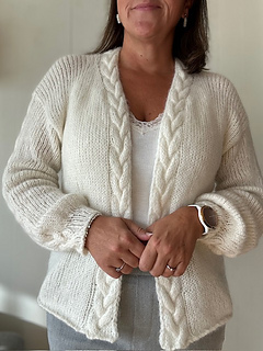 Denne cardigan har en delikat flette som følger fra hver side av nakken og nedover i front, samt fletter på oversiden av hvert erme.