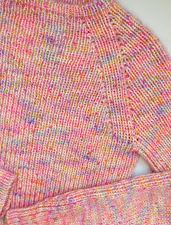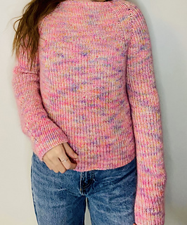 The Snuggly Sweater is knitted using two strands of yarn together, top down with raglan increases. The neck is shaped with German Short Rows. The sleeves have a little balloon effect.