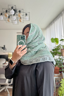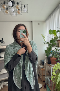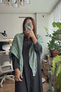 A softly shimmering CC yarn highlights the look of snow on the branches, while the natural color shifts and gentle sparkle of the hand-dyed yarn add the design with warmth and depth. The combination of lace motifs and evenly spaced contrast stripes creates a pleasant visual rhythm, resulting in a shawl that feels both cozy and romantic—much like a glowing Christmas tree. When wrapped around the neck or draped over the shoulders, the shawl forms a comfortable yet elegant silhouette.