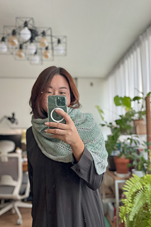 소복하뇽은 눈 쌓인 크리스마스 트리를 모티브로 디자인한 탑다운 삼각숄입니다. 은은한 반짝임이 느껴지는 실을 포인트 배색으로 활용하여 트리에 내려앉은 눈을 표현했고, 손염색실 특유의 색감이 만들어내는 자연스러운 색의 변화와 반짝임이 더해져, 크리스마스 트리의 따뜻하고 낭만적인 분위기를 고스란히 담아냈습니다. 레이스 패턴과 배색 줄무늬의 균형 있는 조화가 시각적 리듬감을 더하며, 목을 감싸거나 어깨에 걸쳤을 때 편안하면서도 우아한 실루엣을 완성합니다.