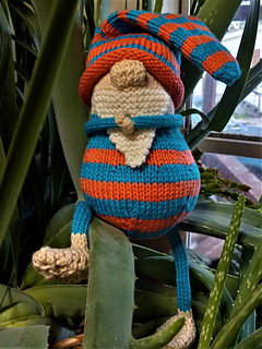 This is a pretty easy knit. It’s made in the round (except for beard and feet). You can really have fun with the colors. Give him (or her with no beard) different skin tones and beard and outfit colors. The Gnome is big enough to be seen across the room. Cute enough to leave out year round, if you like!