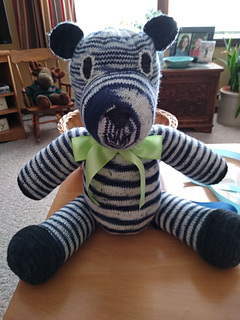Teddy bear knitted with patterned sock yarn. Approximately 16 inches (40 cm) tall.