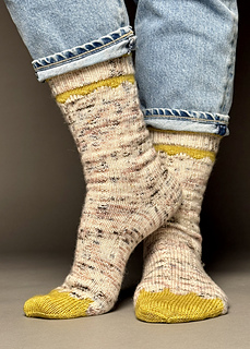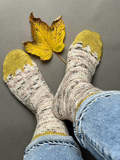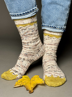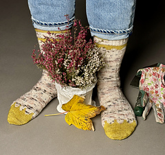 Mit Socke »Botanik« strickst du dir eine hübsche zweifarbige Socke. Das kleine Colourwork Band findet sich am Schaft und am Fuß wieder. Am Schaft wird es durch ein welliges Rippenmuster abgelöst. Als Ferse habe ich eine gut sitzende Bumerangferse