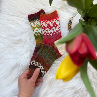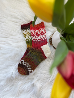 These cozy colourwork socks with a small bird motif were created as a warm and playful pair for a little girl. The design combines variegated sock yarn with simple texture and colourwork elements, making each pair unique and fun to knit.