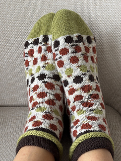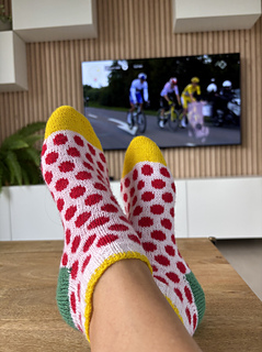The inspiration for these cheerful polka-dot socks came while watching the Tour de France. The red polka-dot jersey made me happy, so I decided to turn it into a sock. With cuff, heel and toe in Tour colors, it became a sporty summer ankle sock. Later, I developed the design into a more stylish colorwork sock with a longer leg and rolled cuff: the Socks with Balls. Both the sporty and the stylish design are included in this pattern booklet, and can be easily adapted to your favourite color theme. The instructions in this booklet are provided in three languages (Dutch, English, German), each clearly marked with colors. In addition, the pattern includes print instructions per language. I wish you lots of knitting fun! Separate pages are included for heel/foot and toe instructions. Enjoy your knitting!