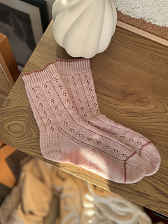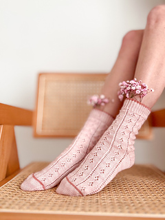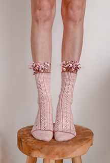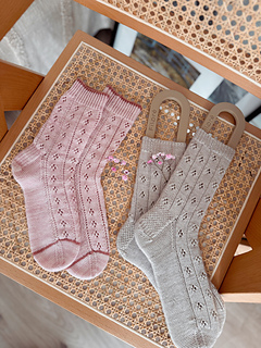 O WZORZE: Skarpetki są przerabiane od góry do dołu metodą magic loop. Zaczynamy od ściągacza z oczek przekręconych, a następnie zaczynamy pracę ze schematem. Konstrukcja obejmuje piętę z klapką, co zapewnia dobre dopasowanie i komfort noszenia. Koronkowy wzór płynnie przechodzi przez górną część skarpetki, a subtelne zwężenia na palcach gwarantują estetyczne wykończenie. Całość zamknięta jest metodą Kitchener Stitch, co daje gładkie, niemal niewyczuwalne łączenie.