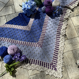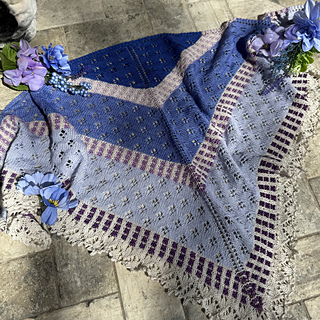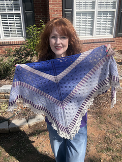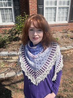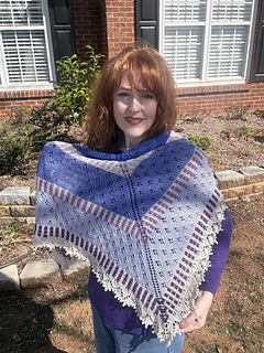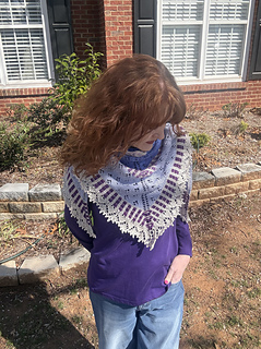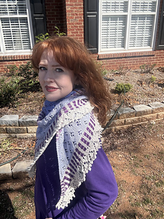 The yarn recommended is Moonglow Yarn Co’s Moonlit Lilac Spring 2026 collection. You will need her fingering weight shawl kit.
