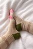 The Soft Play Socks are worked from the top down, beginning with the ribbed cuff. After completing the ribbing, a few centimetres of stockinette stitch are worked before introducing a ten-round section of colourwork using two contrasting colours.