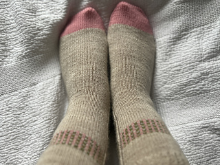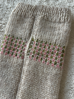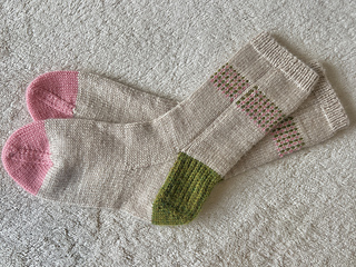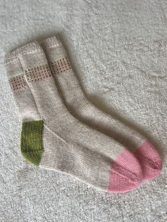 Once the colourwork section is complete, the socks continue in stockinette stitch until the heel. The heel features a classic heel flap and gusset construction, making it straightforward to knit and comfortable for a variety of foot shapes.