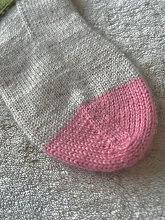 To finish, the foot is worked to the desired length, followed by simple toe decreases. The stitches are then grafted using the Kitchener stitch for a clean, seamless finish.