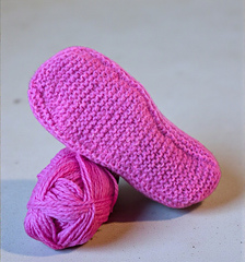 Til slutt strikkes sålen frem/tilbake på pinnen samtidig som sidemaskene felles.