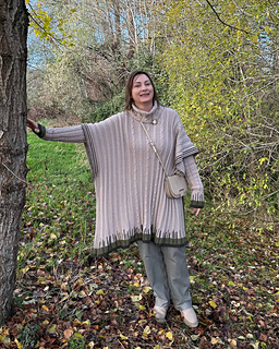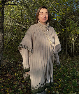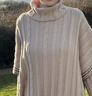 The poncho is worked in one piece from front to back, with thoughtful neck shaping and a generous roll neck that sits comfortably without bulk. Matching arm warmers complete the set and carry the same natural textures.