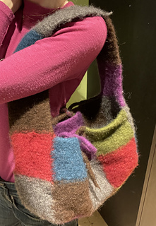 SOLAR BAG is knit in a feltable chunky yarn, here in Vams from Rauma. Mix and match the colours as you wish. I have here used grey and brown as a basis, featuring red, blue, purple and green.