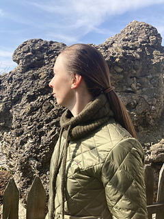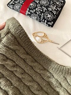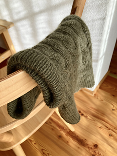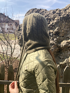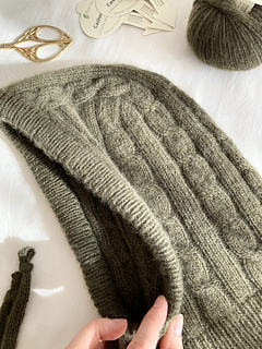 Die olivgrüne Solène Hood wurde mit Cashmere 6/28 von Pascuali in der Farbe 90 Oliv gestrickt.
