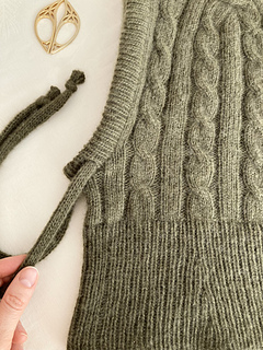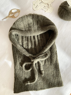 The olive green Solène Hood is knitted with Cashmere 6/28 by Pascuali in color 90 Olive.