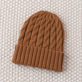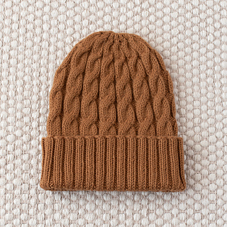 The Solid Ground Hat is knit in the round from the bottom up with DK-weight merino wool. The design features cables.