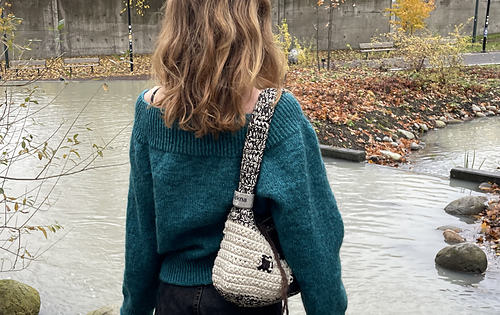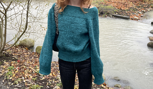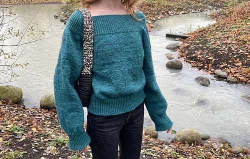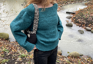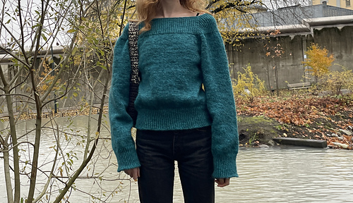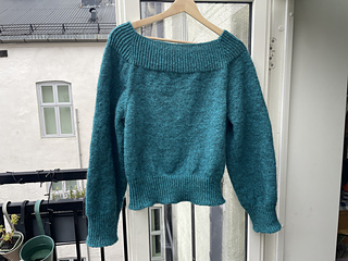 Sontag sweater is a slightly oversized off-the-shoulder sweater. Here knit in beautiful turquoise Varde yarn from Hillesvåg (size S-M in photos).