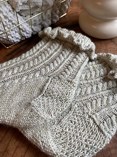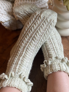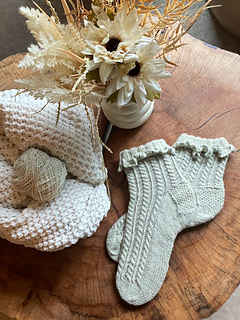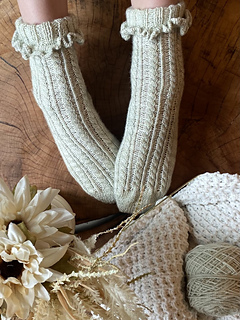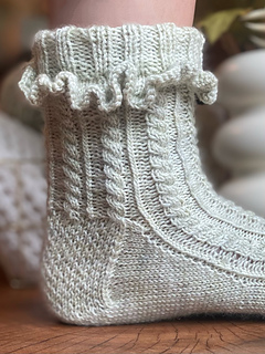 The Sonya Socks are inspired by the tender resilience of Dostoevsky’s Sonya Marmaladova, a character who bears sorrow with grace and soft beauty. The delicate texture and feminine frills make these socks perfect for curling up in a library with a book or curled beneath a blanket with a new cast-on.