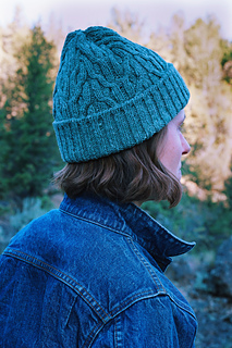 The South Sister hat features a beautiful cable pattern and an optional pompom. When travelling through the central Oregon desert, it is not hard to fall in love with the Sisters mountain range. The triple peaks maintain hints of snow even in the high heat of July, and it is a welcome sight to see snow nestled in the valleys. Enchanted by the landscape, the designer Lis Smith couldn’t help but dream up knitted cables to match: a peaked hat was the most fitting way to mimic the shape of the mountain, with the thick cables tracing the lines of snow on the slopes.
