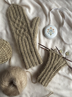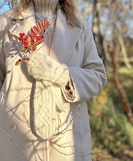 Intermediate. The mittens are not suitable for beginners. Complex cables are made and you need to know how to decrease and increase. For some parts of the pattern there are only charted instructions, not written.